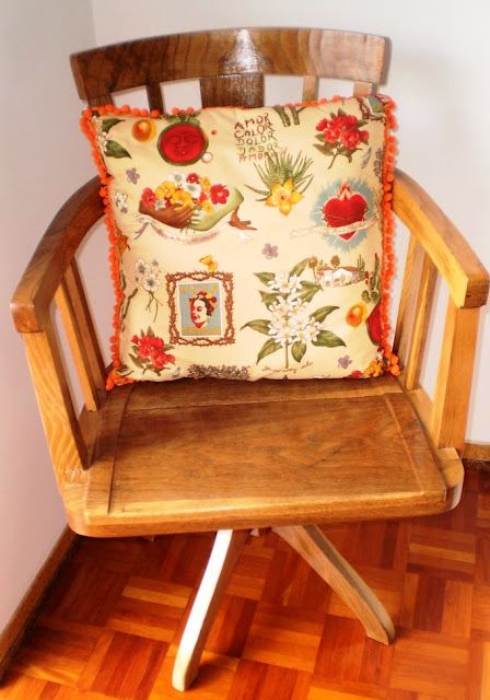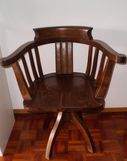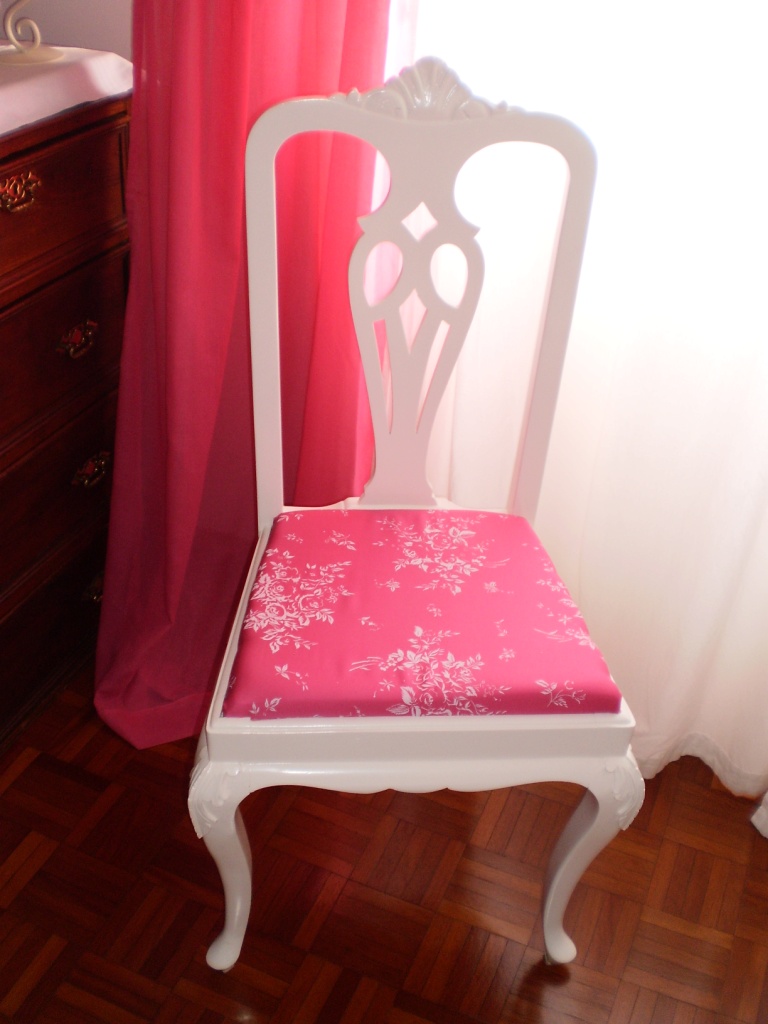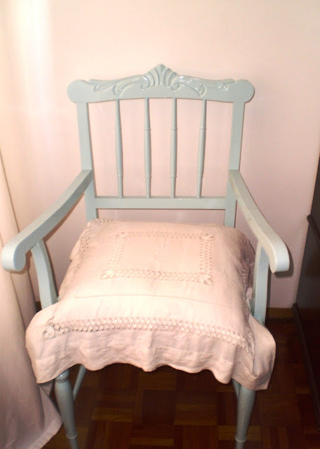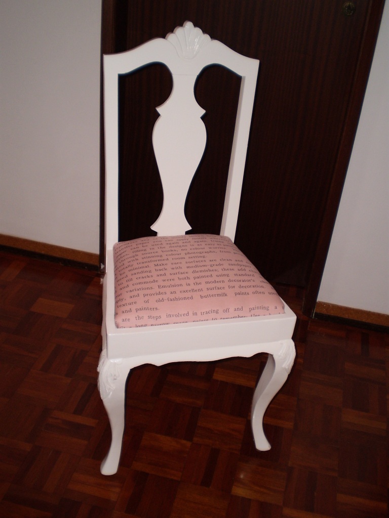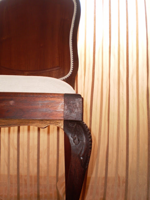 Isso mesmo, sente-se... São todas Queen Anne, ou "kinane" como dizia a minha avó! E olhe, foram todas respigadas por mim! Qual é o espanto? Nunca comprei uma cadeira cá para casa, quando tenho falta de cadeiras vou dar uma volta pela rua! Aparecem tantas e tão lindas, não acha? Estas foram restauradas, pintadas, revestidas e aqui estão elas todas bonitas! O cadeirão até ganhou uma almofada centenária, oferta de uma amiga do coração, era da avó dela. E a última? Bem, essa não fui eu que respiguei, na verdade foi o J que também já apanhou a doença, restaurou-a toda, estava em muito mau estado. Comprei um tecido neutro desta vez e as borlinhas foi só para dar um ar. Então, gostou?