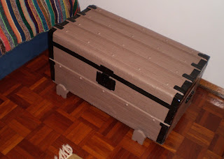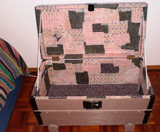 Encontrei este baú em Lisboa, em 2009. Fui visitar um dia a minha avó Luisa e quando vinha a saír de casa dela, ao passar na Rua Coronel Marques Leitão em Alvalade reparei num contentor de entulho a abarrotar de tralha. No cucuruto estava este baú velho. Andava a precisar de um e queria um daqueles de folha, mas não tinha ainda encontrado (no lixo, claro) nenhum que estivesse capaz de ser respigado e restaurado. Fui ver melhor e este apesar de ser de madeira pareceu-me bem...