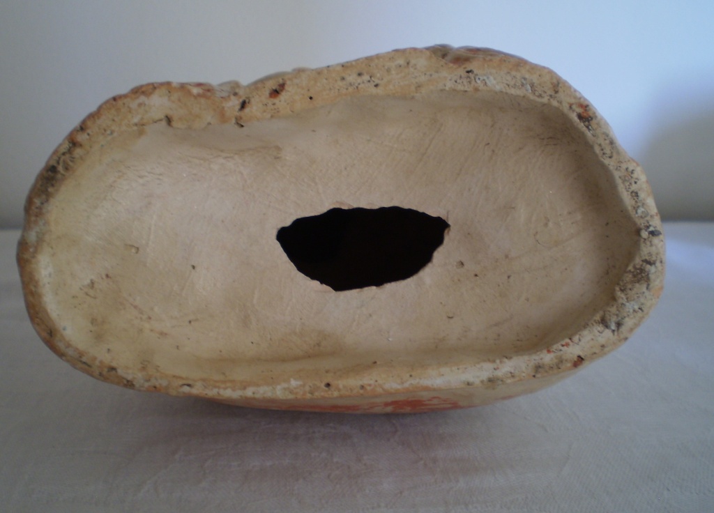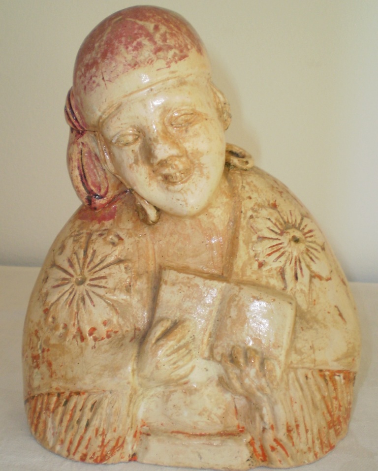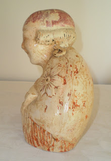 Em terracota, policromada, mas apenas com pequenos resquícios das cores, esta peça, provavelmente do início do séc. XX, tem outro pormenor curioso: além de fortune teller, esta ciganita é também uma fortune keeper, pois tem uma abertura nas costas para ser usada como mealheiro! Tive de a colocar no quarto, perto de mim, tal era o seu ar de dona da verdade com aquele sorrisinho escarninho a olhar de lado para nós como quem diz: Anda cá, dá uma moedinha à cigana que a cigana não te engana!