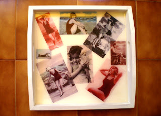 Recortei umas estampas vintage alusivas ao mar e à praia, colei num tabuleirinho pintado de branco com tinta acrilica e depois de secas as estampas foi só aplicar a mistura para fazer o vidrado. Leva algumas horas a secar mas depois de solidificado aguenta liquidos e objetos quentes em cima sem se riscar ou danificar.