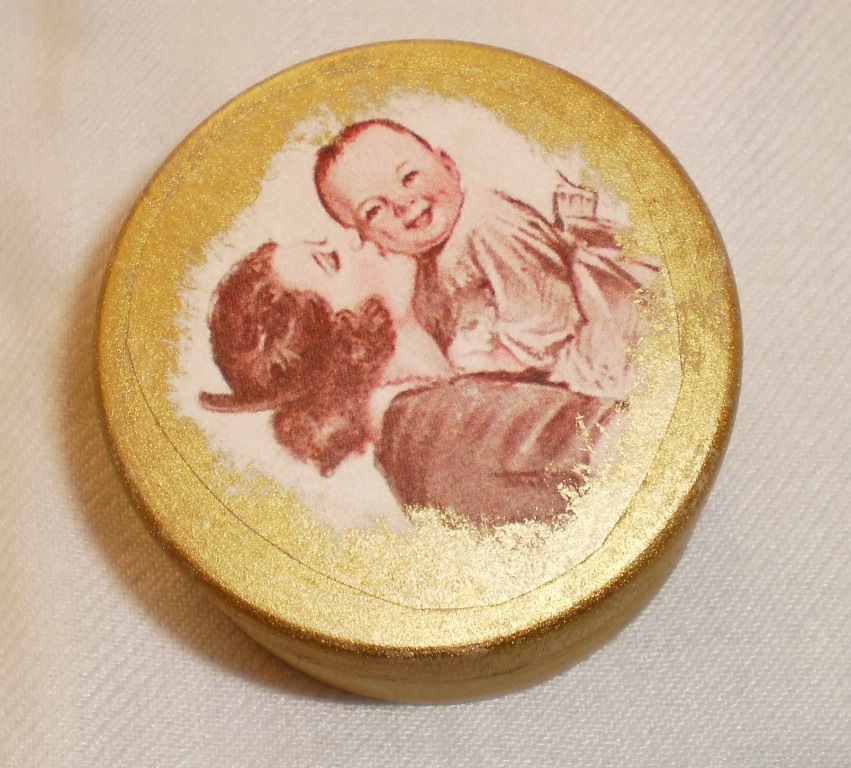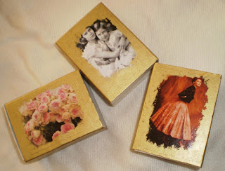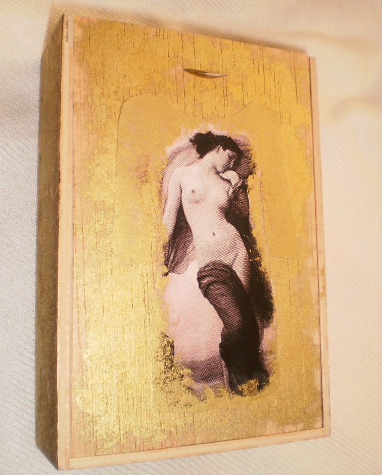 Fiz esta com uma caixinha de fósforos, com uma pequena pintura de tinta acrílica dourada sobre uma estampa vintage préviamente colada!