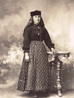 Originária de perto de Leiria, provavelmente da Freguesia de Santa Catarina da Serra, esta figura imponente, usando chapéu de penacho, calçando botas e ostentando voltas de ouro ao pescoço, era sem dúvida uma mulher que as demais admiravam. A minha avó, que mal se lembrava dela copiou o chapéu, por ser igual a um que a sua propria mãe usava em alturas de festa, e é lindo! Feito com rigor e paciência e que eu oportunamente mostrarei.